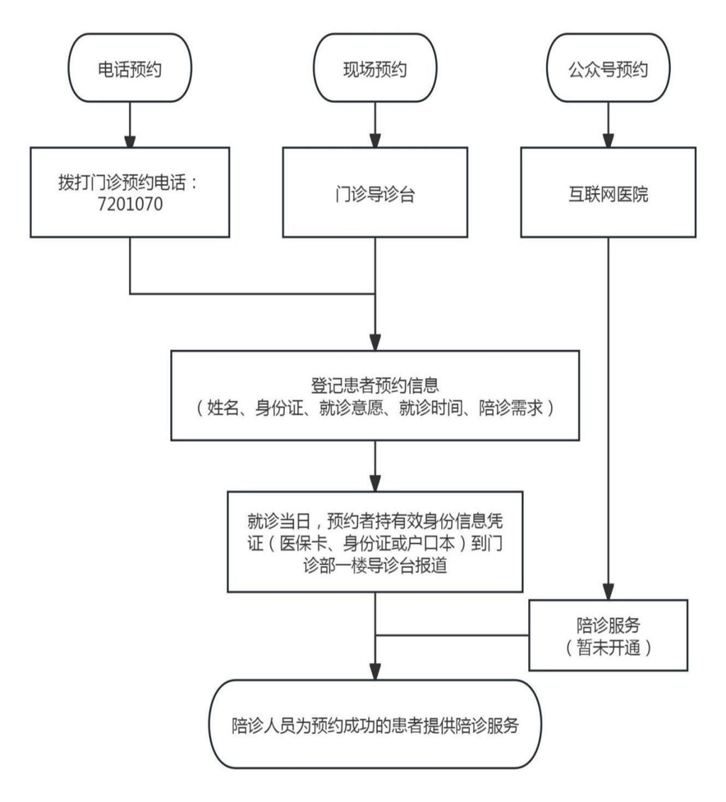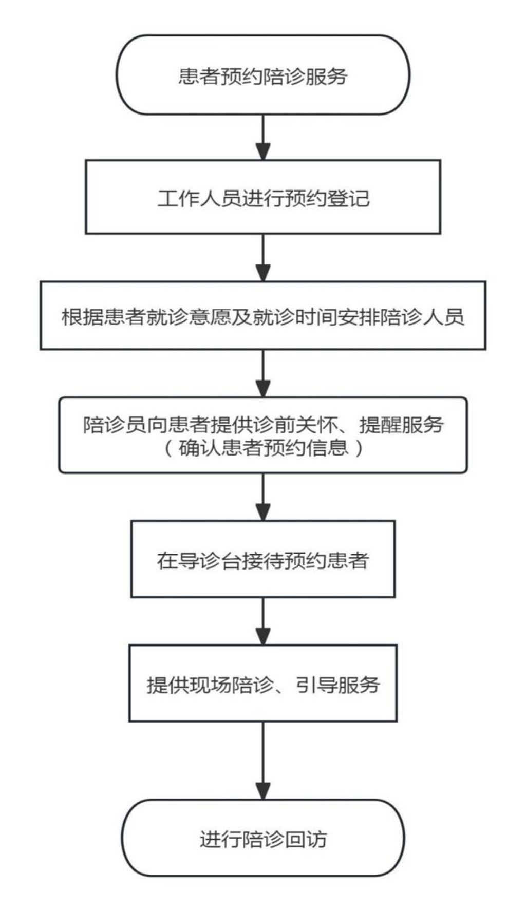 就诊者或家属直接到门诊一楼大厅导医台进行陪诊服务预约;门诊导医台工作人员进行预约审核,联系陪诊人员,即可进行陪诊服务。