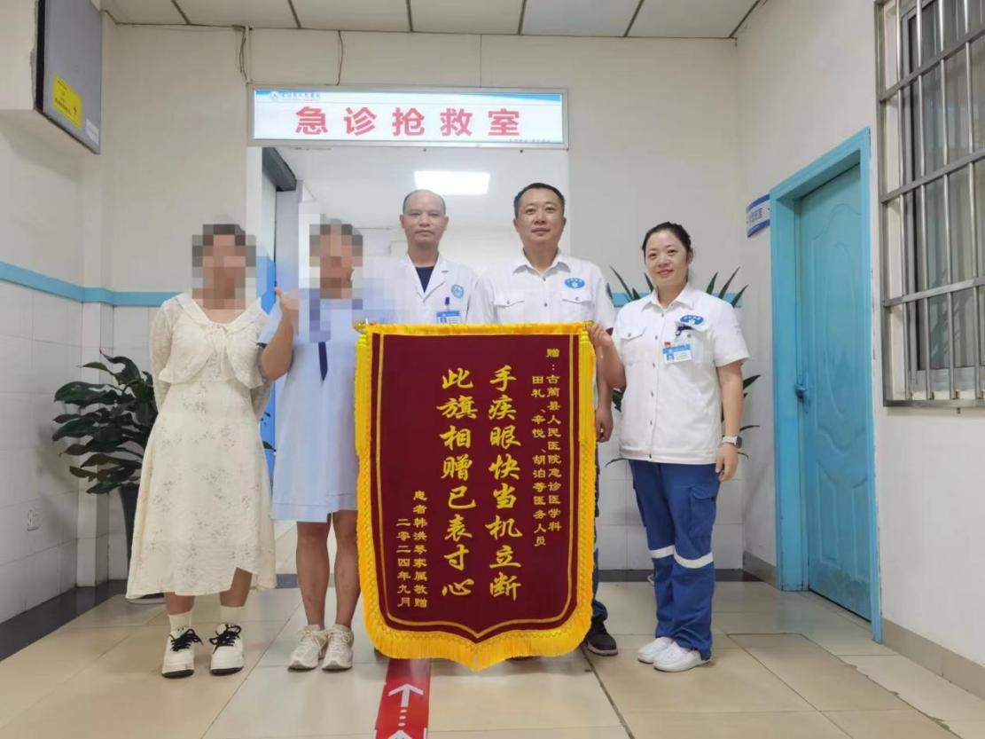 近日,患者韩女士(化名)家属将一面印有“手疾眼快当机立断,此旗相赠已表寸心”的锦旗送到了古蔺县人民医院急诊医学科,真挚地感谢急诊医学科医护人员的及时施救,使85岁的高龄患者转危为安。