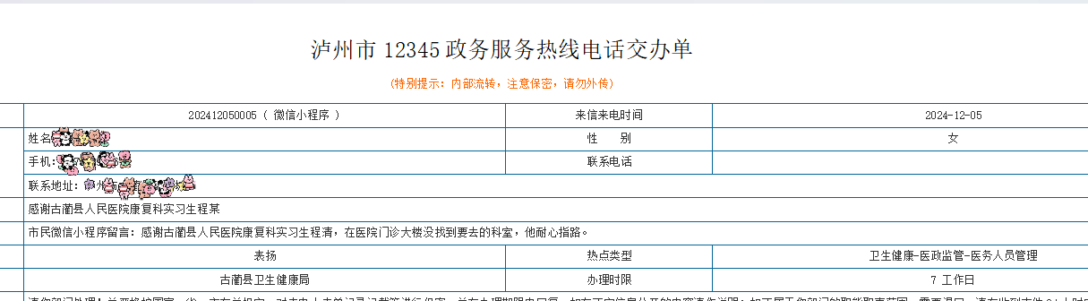 “感谢古蔺县人民医院康复医学科实习生程清,我在医院门诊大楼没有找到要去的科室,正好遇到程清路过,他非常耐心地引导我找到了就诊科室。”税女士(化名)在泸州市12345政务服务市民微信小程序中这样写道。