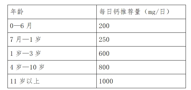 乳类是儿童最佳钙源,6个月内纯母乳喂养即可;6—12个月每天保证600—800ml奶量;1—3岁不少于600ml;4—7岁400—500ml;7岁以上300ml。