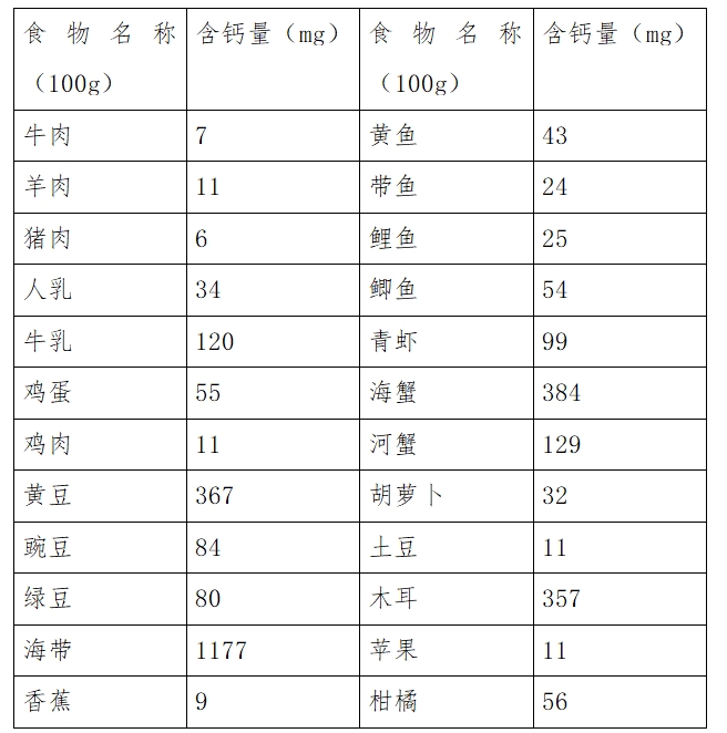 不同食物每100g含钙量