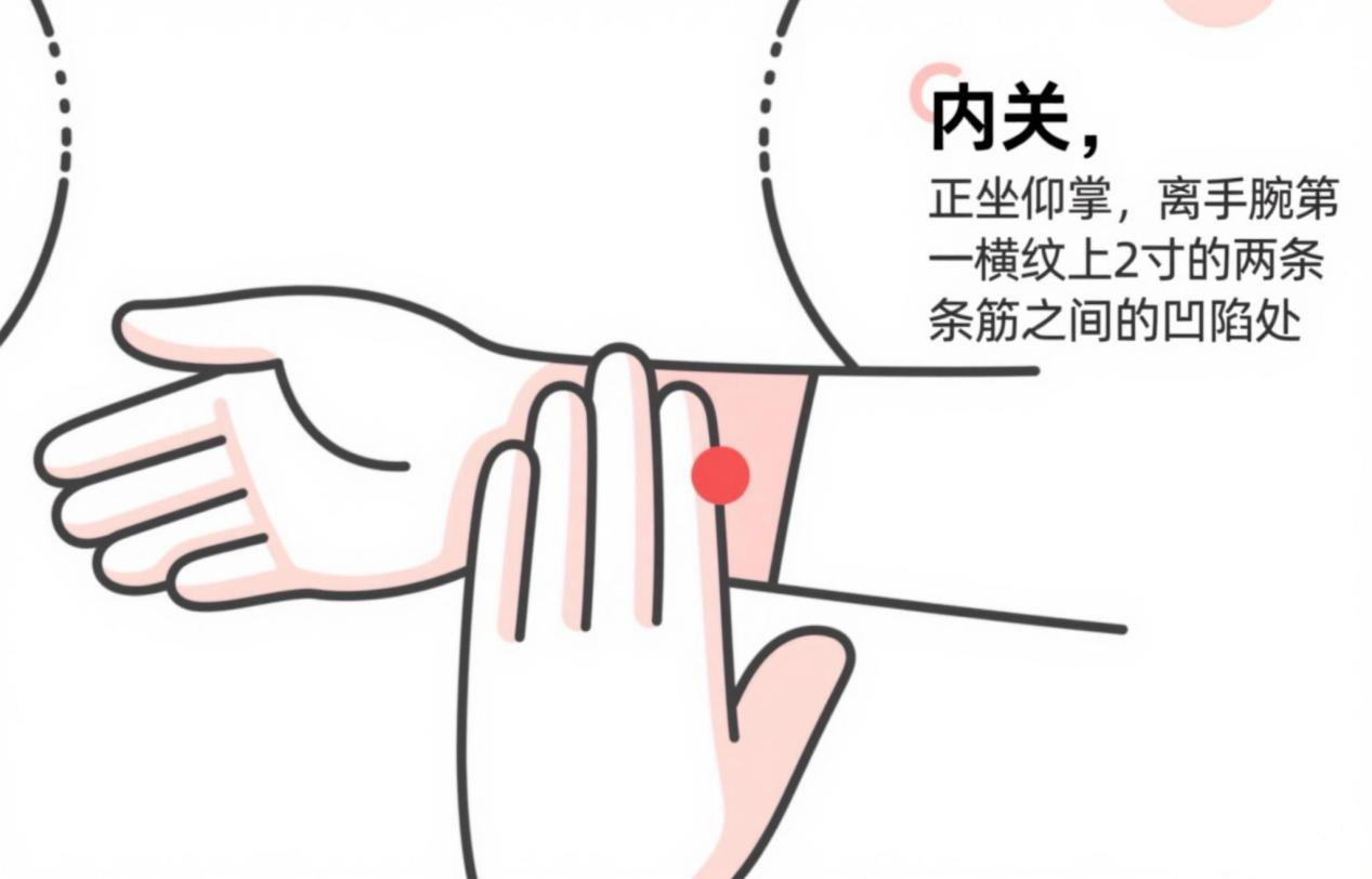 穴位减压法:按摩“内关穴”(手厥阴心包经),用拇指指腹按压对侧穴位,以产生酸、麻、胀感为宜,每次3—5分钟,左右交替,每天2—3次。按压时配合深呼吸,吸气按压、呼气放松,专注穴位,镇静安神。