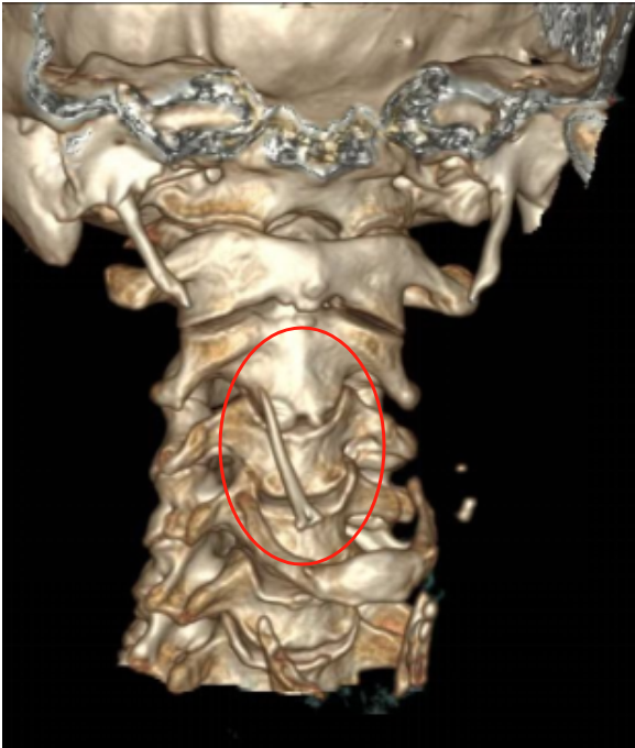 门诊医生检查时,眼前的景象令人揪心:陈老太的咽部黏膜充血肿胀,右侧咽旁隆起如鸽蛋,完全遮挡了会厌谷和梨状窝——这是咽喉要道的“交通枢纽”!更可怕的是,CT片显示,陈老太右侧梨状窝内,一根3-4厘米的鱼刺如利刃般刺入咽侧壁,尖端紧贴颈部大动脉,周围组织已出现严重感染。