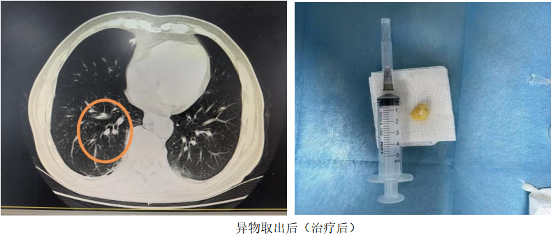 果然,电子支气管镜探进去一看,右下叶支气管里藏着个小东西。好在医生“手疾眼快”,通过支气管异物取出术顺利将其“缉拿归案”。术后复查CT,原本发炎的肺部已经清爽如初,刘大爷很快就康复出院了。