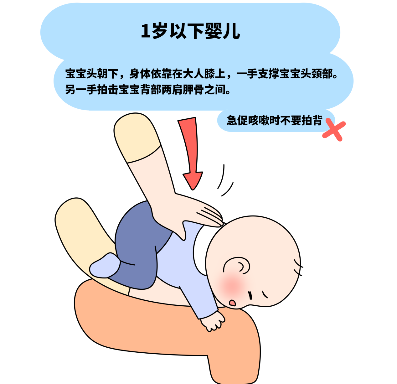 让婴儿头低脚高地趴在施救者的前臂上,拍打其背部5次;然后将婴儿翻转过来,按压胸部5次,如此交替进行。