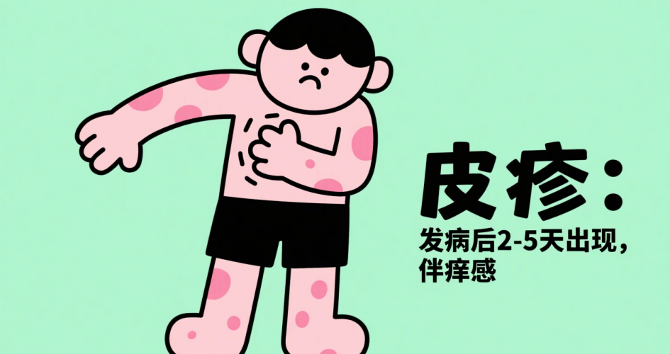 皮疹:约80%的患者在发病后2至5天出现皮疹,多见于躯干、四肢伸展侧、手掌和足底等部位,常伴有明显痒感。