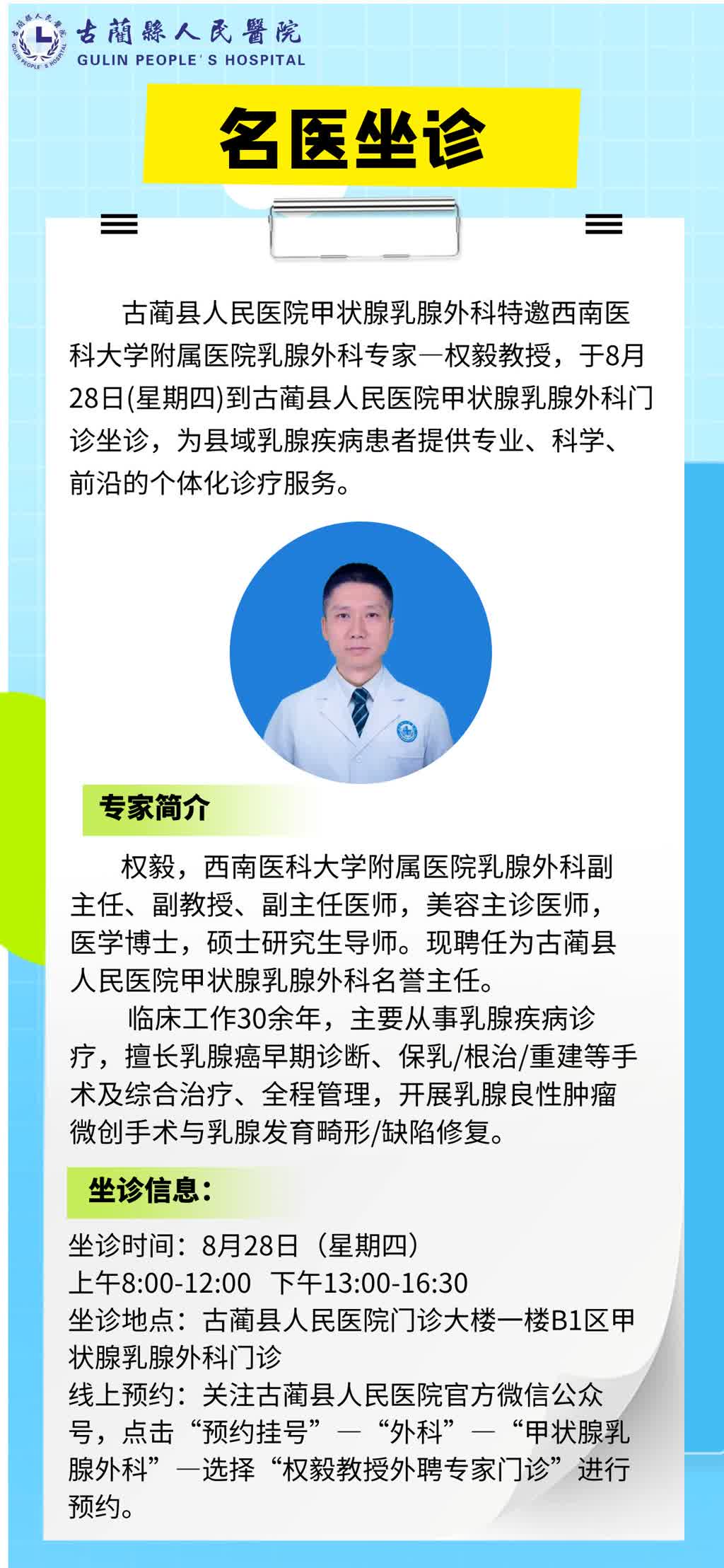 【专家坐诊】西南医科大附院权毅教授8月28日到古蔺县人民医院“甲乳”外科坐诊