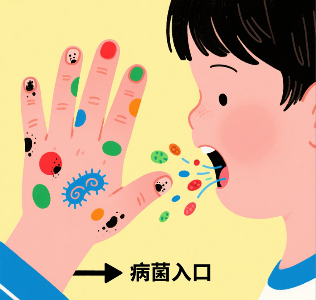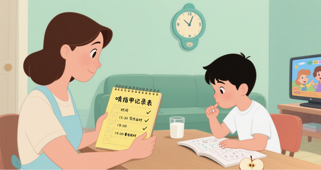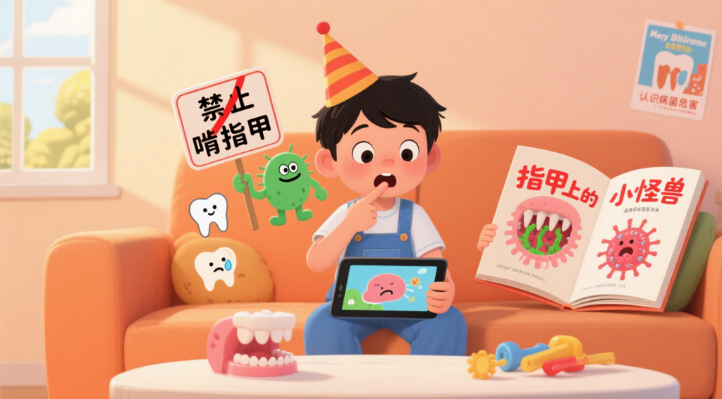 不强行掰手、涂苦甲水(易引发反感),可与孩子约定秘密提醒手势(如轻拍手背);也可以通过绘本、动画,让孩子主动认识到啃指甲的坏处。