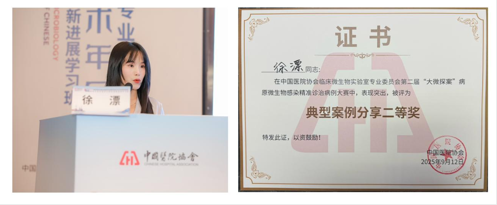 医学检验科临床微生物组组长徐漂自5月接到赛事通知后,积极备战、双线参赛。在“大微探案”病原微生物精准诊治病例大赛中,她历经全国线上初选,从百余份病例中成功晋级全国南区半决赛,并于8月16日在成都线下半决赛中突围,跻身全国总决赛。作为决赛中唯一一名来自县级医院的选手,徐漂沉着冷静、发挥稳定,以案例《莫显乎“微”,莫显乎“隐”》进行了深入剖析与精彩汇报,赢得了评委的高度认可,最终以总分第二的成绩荣获二等奖,充分展现了基层微生物工作者的专业水平。
