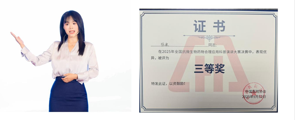 与此同时,在“全国临床微生物检验与抗菌药物合理应用科普演讲大赛”中,徐漂同样表现突出。她从全国近百件作品中历经初选、复选闯入决赛。决赛以真人现场演讲形式进行,竞争激烈、创意频出。徐漂高效兼顾两项赛事,虽为首次参与科普竞赛,仍凭借扎实的内容与出色的表达,以作品《“霉”丽杀手-黄曲霉的双重威胁》荣获三等奖。