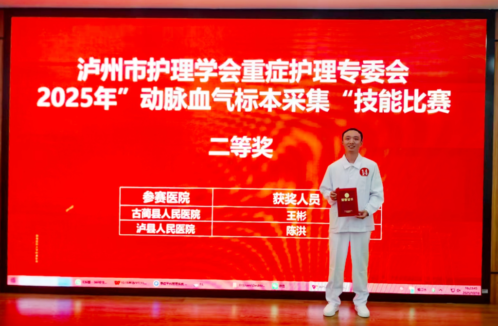 在10月18日举办的泸州市护理学会重症护理专委会2025年“动脉血气标本采集”技能比赛中,古蔺县人民医院重症医学科护士王彬凭借扎实的专业功底与娴熟的操作技能,沉着应战、发挥出色,最终从众多参赛选手中脱颖而出,荣获大赛二等奖!