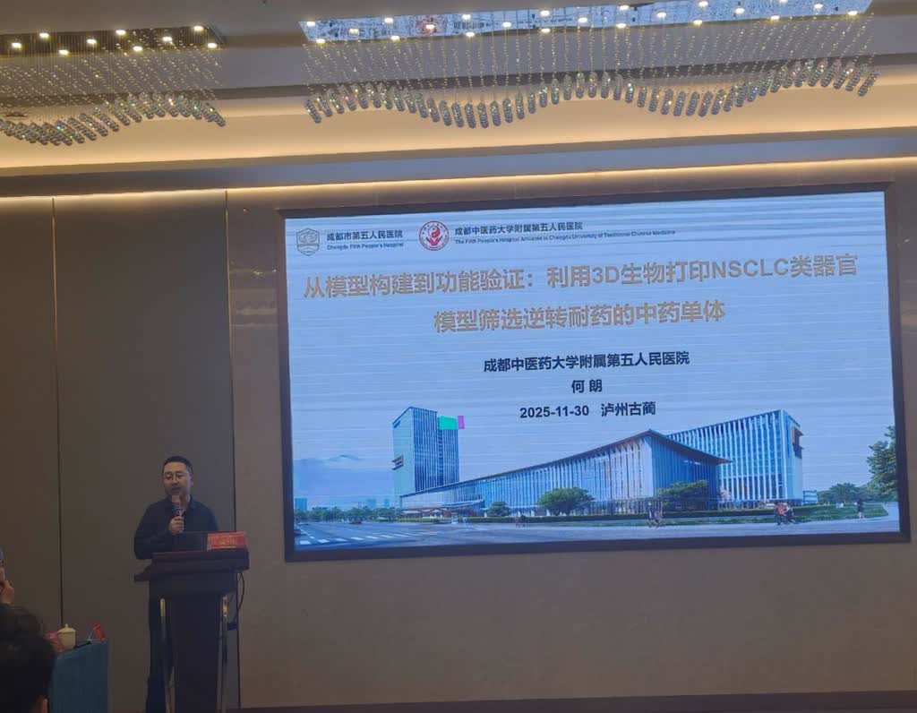 学术交流环节紧扣临床实际,内容兼具前沿性与实用性。成都市第五人民医院何朗教授以《从模型构建到功能验证:利用3D生物打印NSCLC类器官模型筛选逆转耐药的中药单体》为题,分享了通过3D生物打印技术构建非小细胞肺癌类器官模型,并筛选逆转耐药中药单体的创新成果,为肿瘤精准治疗开辟了新路径。