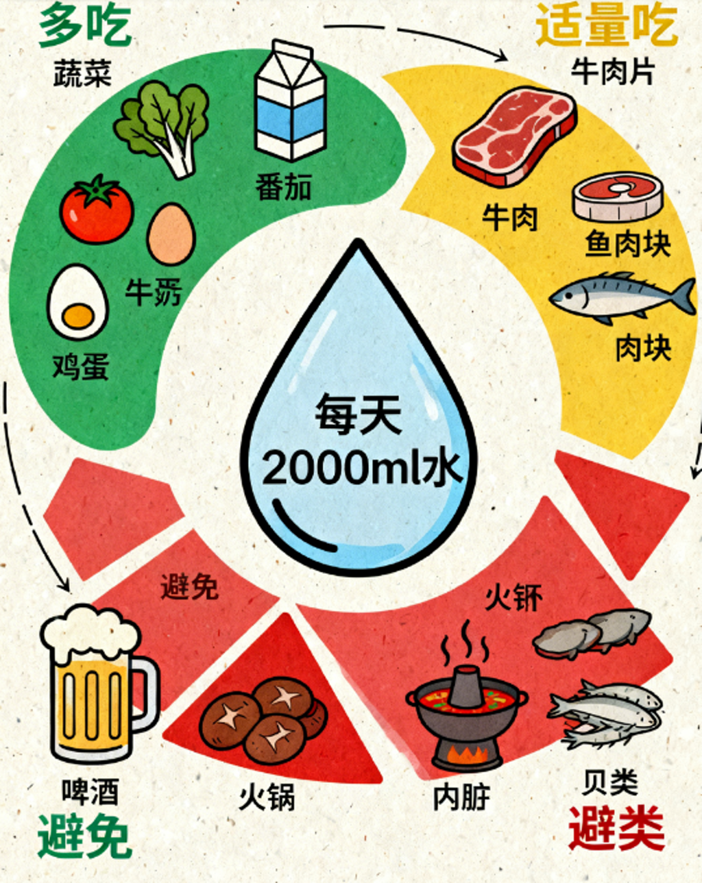 1.尽量少吃:动物内脏、浓汤、火锅汤、贝壳类、啤酒、白酒、含糖饮料。