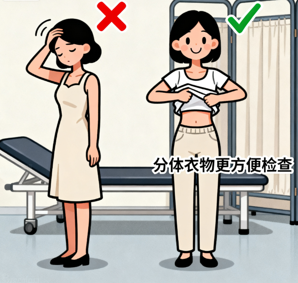 2. 穿对衣服:记得穿分体式的(上衣+裤子),脱起来方便,检查时不尴尬。