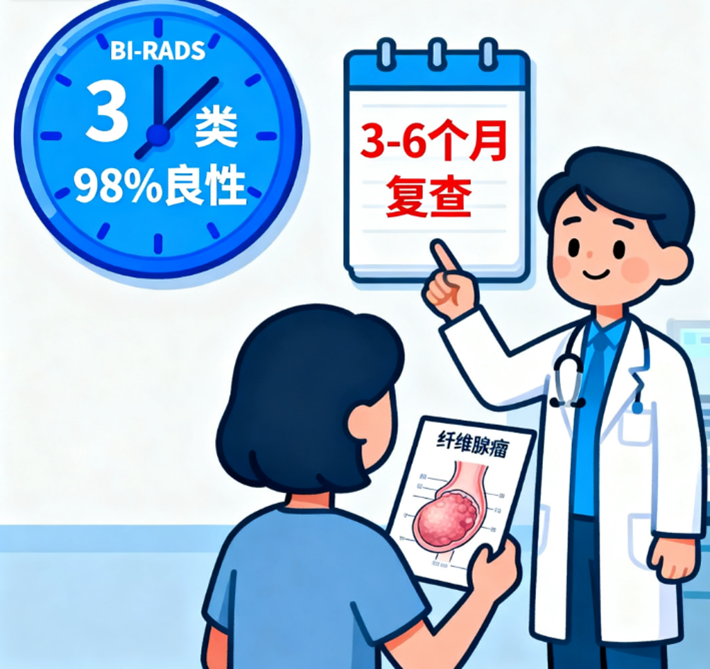 3类:放宽心!98%以上都是良性的(比如年轻妹子常见的纤维腺瘤),恶性风险≤2%。不用做手术,每3-6个月回来复查一下,看看它有没得变化。