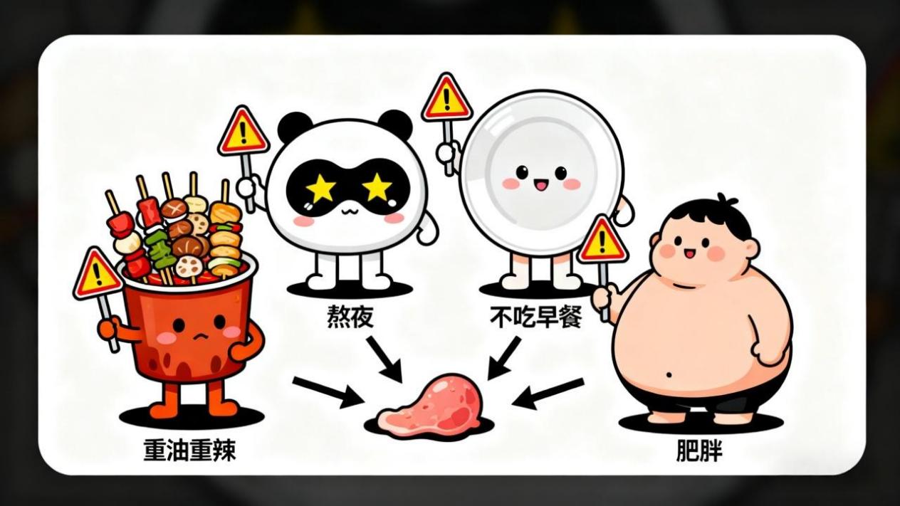 饮食不规律、暴饮暴食:不吃早餐是大忌!胆汁存了一晚上,不吃早餐导致胆汁不能及时排出去,容易“闷”出息肉;