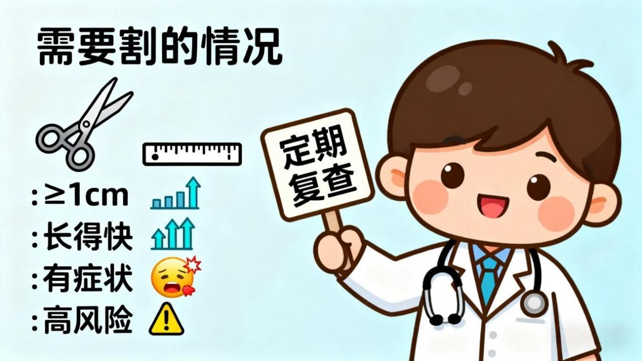 看大小:≥1厘米(10毫米),建议割!超过1厘米恶变风险升高,单发的更要注意;小于1厘米基本是良性,无需手术,定期复查就行。