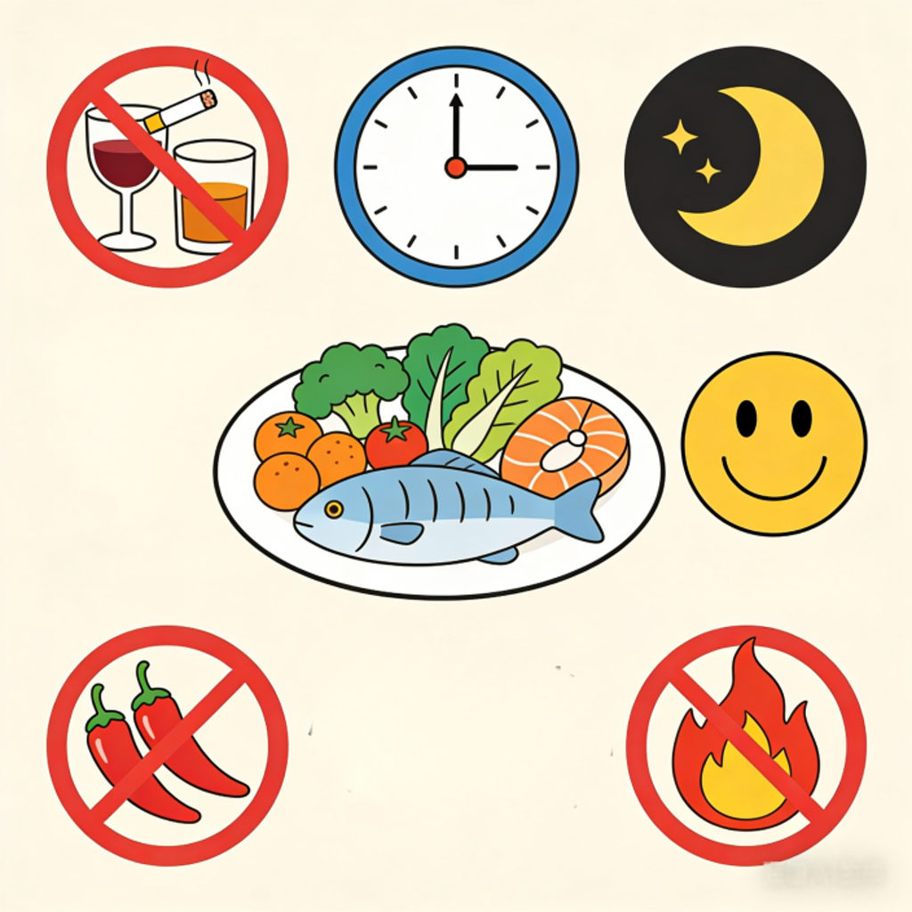 习惯要健康:戒烟戒酒,不熬夜、别劳累,心态放平少生气。饮食清淡,低盐低脂低糖,少吃辛辣刺激。
