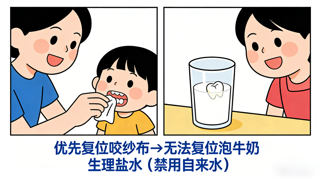 最好塞回去:轻轻塞回原来的牙窝里,让娃儿咬住干净纱布或手帕固定。