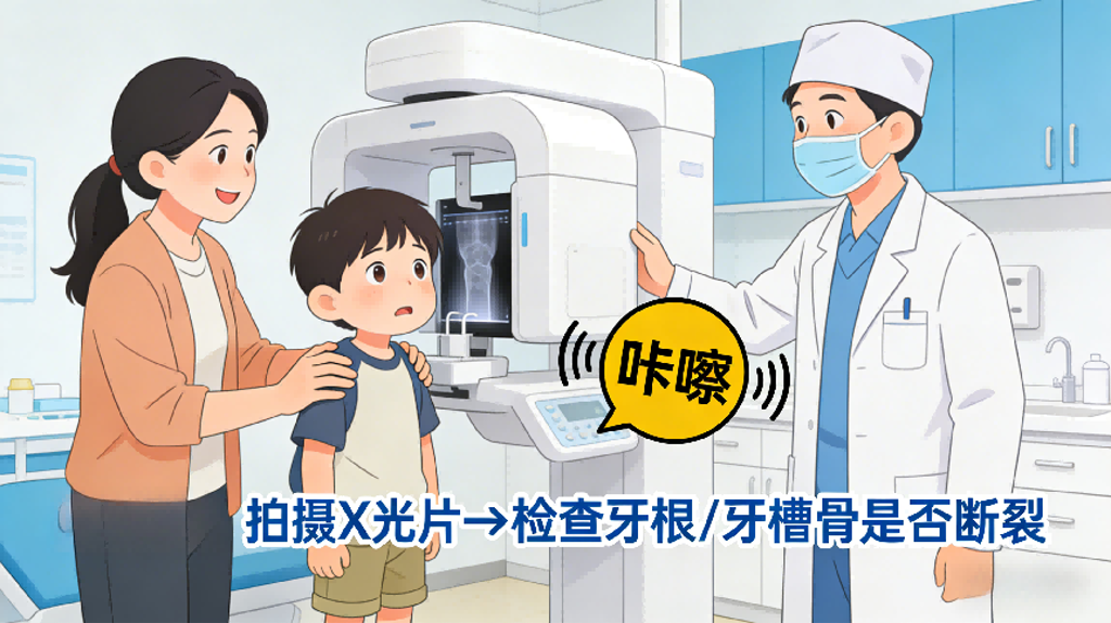 一般会拍个X光片,看看牙根和牙槽骨有没有受伤;还要测试一下牙神经。刚受伤时牙神经没反应不一定就是坏了,小娃儿恢复能力强,复查时再观察。