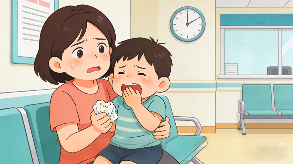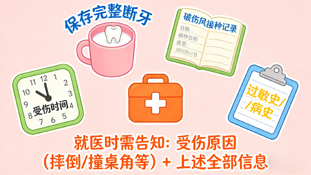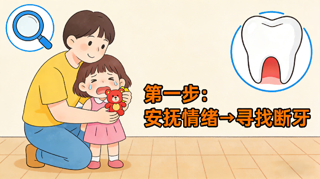 先别慌! 大人自己稳住,哄好娃儿。等娃儿平静点儿,赶紧找掉落的牙齿。