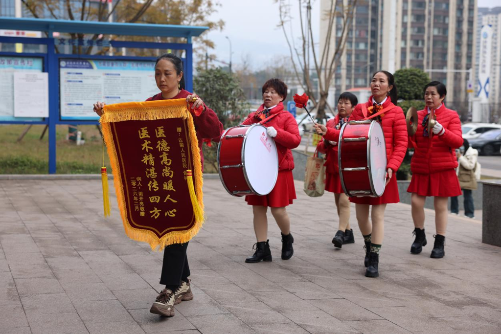 2月4日,古蔺县人民医院门诊大厅外响起阵阵激昂的铜鼓声,这充满地方特色的鼓声,既打破了院区的宁静,也传递着一份跨越生死的真挚谢意——康复患者谢先生的家属手持锦旗走入医院,向骨科全体医护人员表达最诚挚的敬意与感恩。